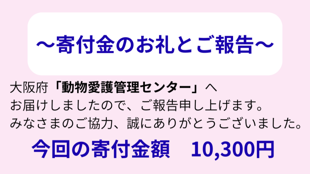みなさまから頂いた寄付金、10,300円を大阪府動物愛護管理センターさんへお届けさせていただきました。ご協力頂き、ありがとうございました。実は、我が家には動物愛護管理センターさんからやってきた保護猫ちゃん(れおちゃん)がいます。そのため、この施... -
